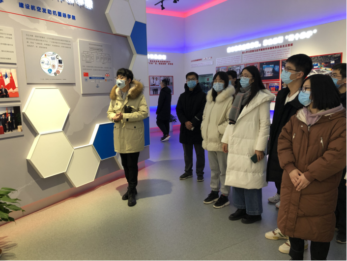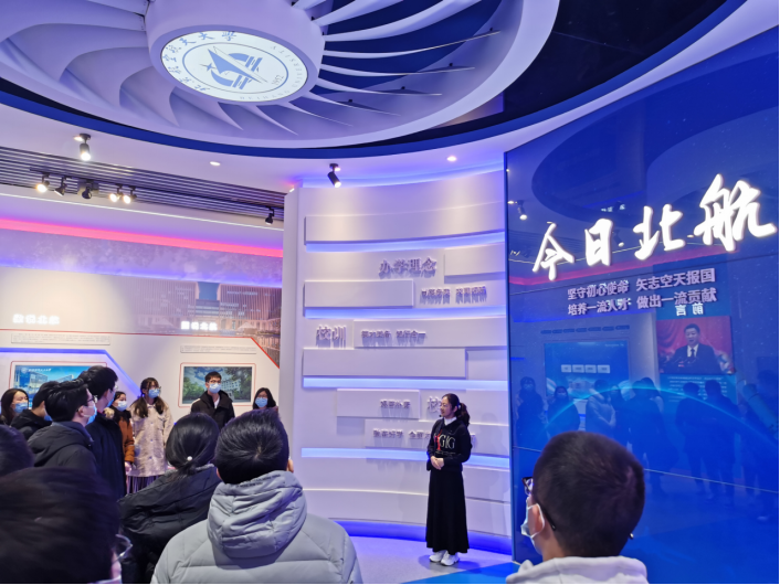 12月16日下午,3003新葡的京集团网址BY1903班组织了以“今日北航”为主题的党团共建活动,旨在让班级同学了解北航历史,关注北航发展,进而增强同学们潜心科研、空天报国的决心。下午三时许,班长陈炼在航空航天博物馆门前组织本班同学做健康登记后,由馆内工作人员带领进入二楼“今日北航”展区。在当前国内新冠疫情好转的情况下,我们依旧没有放松警惕,整个参观过程均佩戴医用口罩以遏制流行病的传播途径。